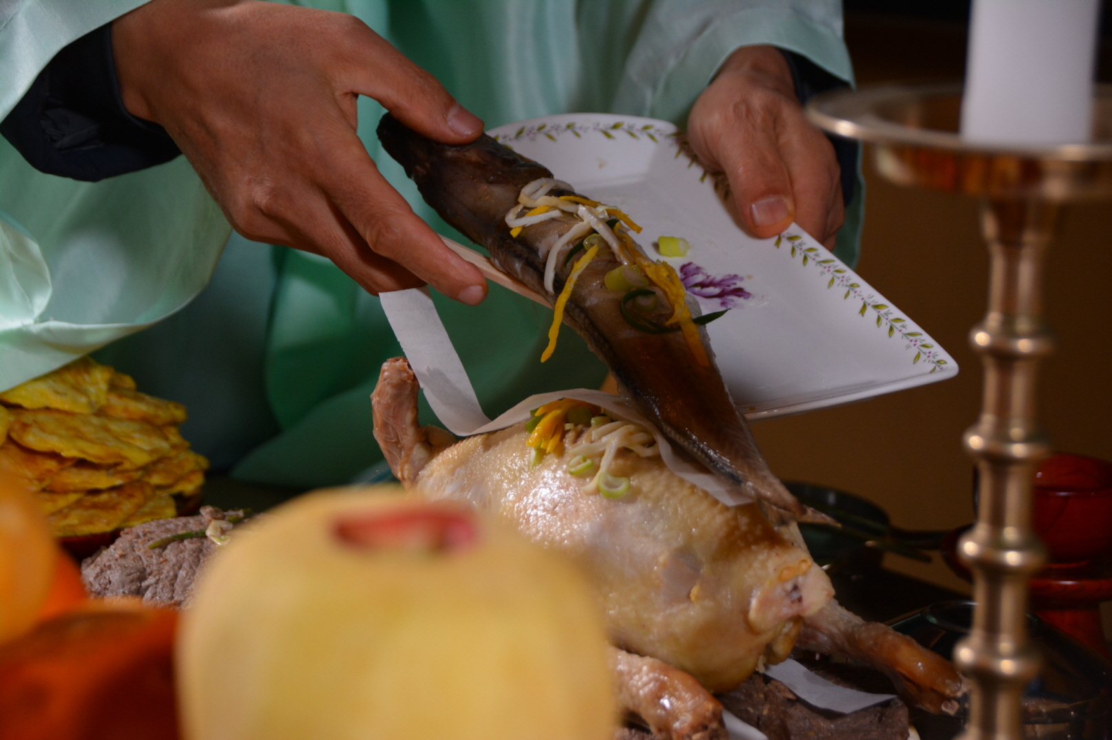 - 육적, 계적, 어적을 올린다. - 삼적을 별도의 제기에 담아두었다가 초헌관이 육적을 올리면 육적 위에 사지를 깔고 아헌관이 계적을 올리고 사지를 깔며 그 위에 종헌관이 어적을 얹는다. - 편 앞에 편채를 올린다.